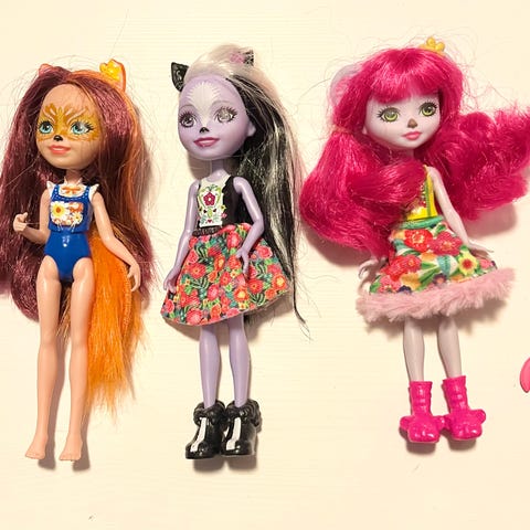 Kuvan Enchantimals -nuket ja lemmikkinsä. Osalla puuttuu korvaa yms.