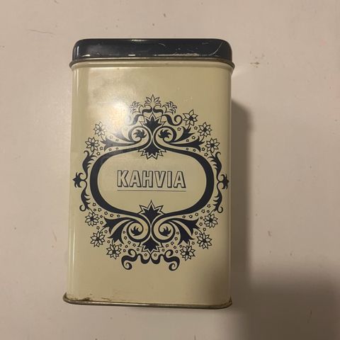 Keskon vaalea kahvipurkki 1960-luvulta. Pinnalla sininen ornamenttikuvio. Kun kannen avaa,
