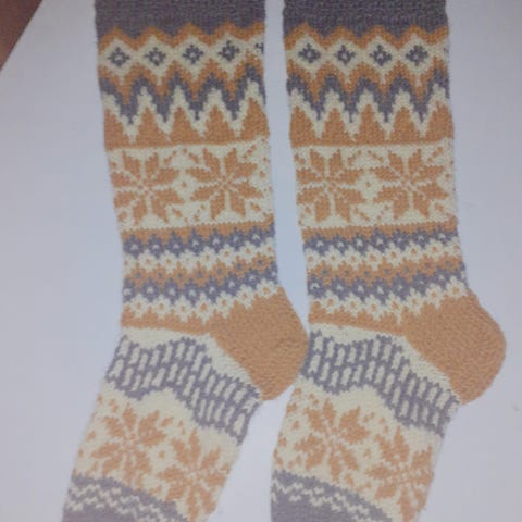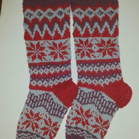 Kirjoneulesukat, lanka 7- veljestä ja vastaava, koko35-36, hinta 15