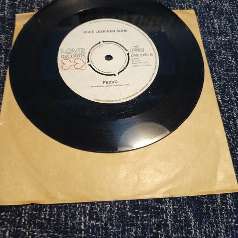Juicen vinyyli. Lähes täydellisen kuntoinen yksilö. Ainoastaan kannessa hintalapun jättämä tahra jota en ole uskaltanut lähteä poistamaan. Näitä ei tässä kunnossa varmaan kovinkaan montaa enää ole. Tästä keräilijän hyllyyn.