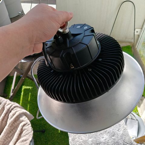 Tehokas teollisuus valaisin halliin/ korkeisiin tiloihin. Riippukiinnitys. N.3-4 vuotta vanha. Nouto tampereen tesomalta