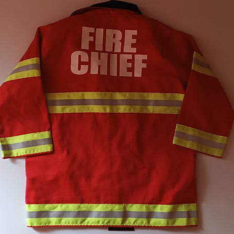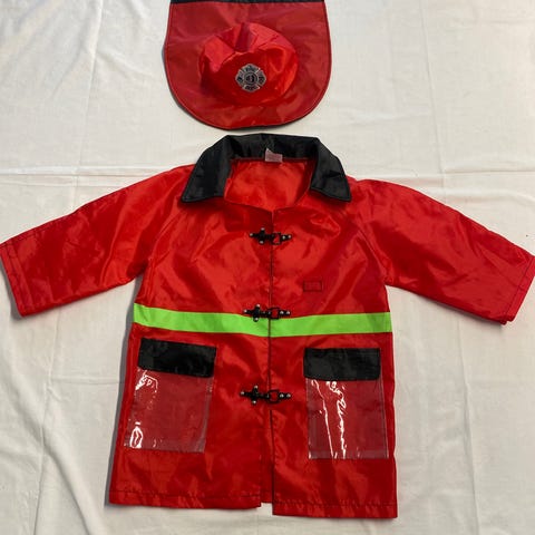 Hauska palomies asu lapsille, siisti ja ehjä. Asuun kuuluu takki ja housut sekä lippis. Takista roikkuu vesiletku, jonka saa laitettua taskuun. Takissa tarrakiinnitys. Lippiksessä lukee Fire, teksti on hieman kulunut, mutta näkyy edelleen. Mukaan myös punainen, muovinen palomieskypärä!