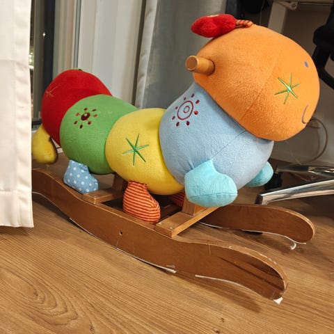 Tarpeettomaksi jäänyt vauvan toukkalelu. Toukkaa painaessa selästä se liikkuu itsestään. Pyörissä pieniä palloja, mitkä helisee hauskasti.