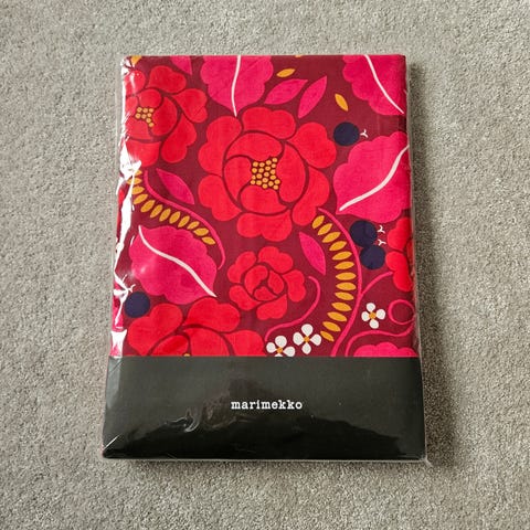 Käyttämätön, vielä alkuperäispakkauksessa oleva Marimekon pöytäliina kuosissa Sonja.