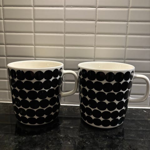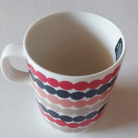 Marimekon räsymatto-muki. Käytössä ollut, mutta erittäin hyvässä kunnossa edelleen. Tilavuus 2,5dl. Nouto Helsingin Kalliosta.