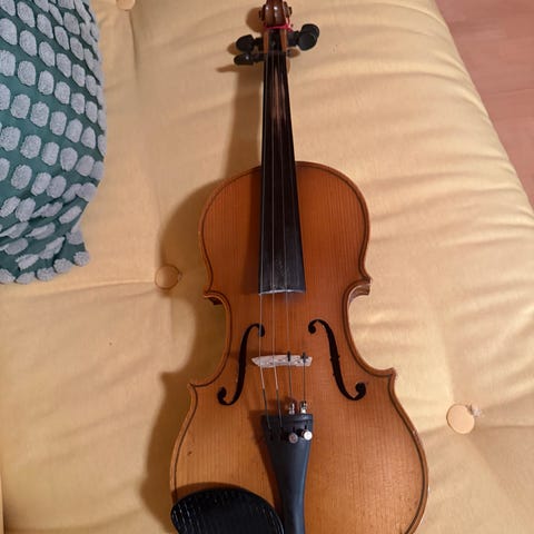 Kaunisääninen viulu tarvikkeineen. Viulun pituus on 54 cm, joten vastaa kokoa 1/2 (3/4). Mukaan jousi, olkatuki, viulukotelo, kankainen suojus, jossa sekä olka- että kantohihna.