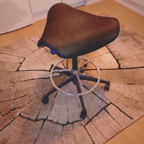 Suomen satulatuoli-keskuksesta ostettu, alk.peräinen hinta n. 250€. Koko S, istuimen korkeus 46-60 cm. Istuimen kulmaa pystyy myös säätämään.
