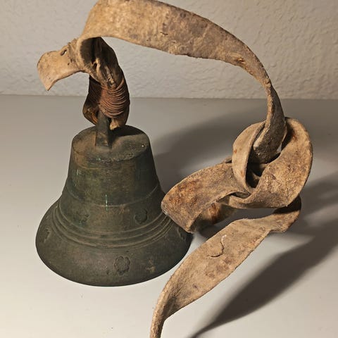 Pohjalaisen mestarin 1800-luvulla valama ja takoma messinkitiuku. Myöhemmin lisätty kahva kiinnitystä varten. Kaikki kolme kieltä tallessa, soi upeasti. Kaupan päälle onnenkenkä. Puhdistettu ja pinnoitettu suomenhevosen "kultakenkä". Postitus 5 euroa. Katso muutkin kellot, samaan pakettiin mahtuu!
