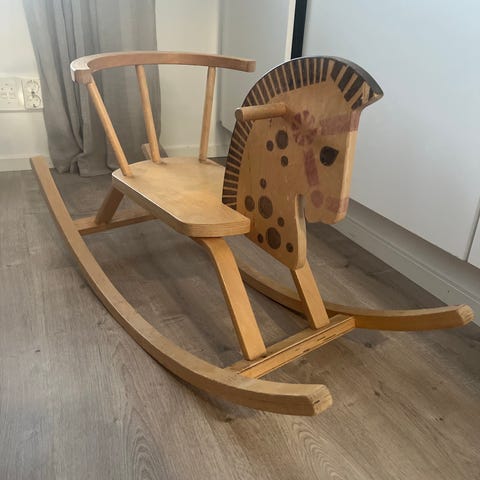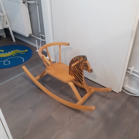 Jämäkkä keinuhevonen. Käytönjälkiä. Hevosen harja leikattu. Tarvii puhdistaa. Pieni halkeama, ei vaikuta käyttöön