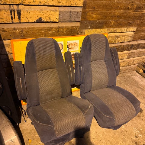 2000 Chevrolet Expressin harmaat StarCraft etupenkit jouten käytetyt mutta ei ole vielä loppuun asti ryypätyt. Kuskin penkin kyynärnojan verhoilu on rikki ja lämmitys ei toimi.