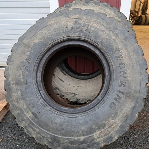 Pyöräkuormaajan kaks päälirenkasta,kuluneet ehjät.Koko15.5-25.