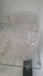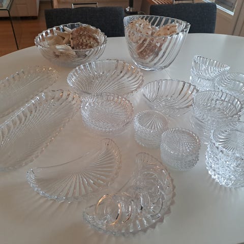 Upeita, uudenveroisia Villeroy&Bochin Platano sarjan erikokoisia simpukankuorta muistuttavia kristalli lasikulhoja ja vateja, jälkiruokakulhoja 12kpl, lasinalusia 16kpl, servettirenkaita 7kpl jne. Myyn myös osissa. Nouto Ruoriniemestä.