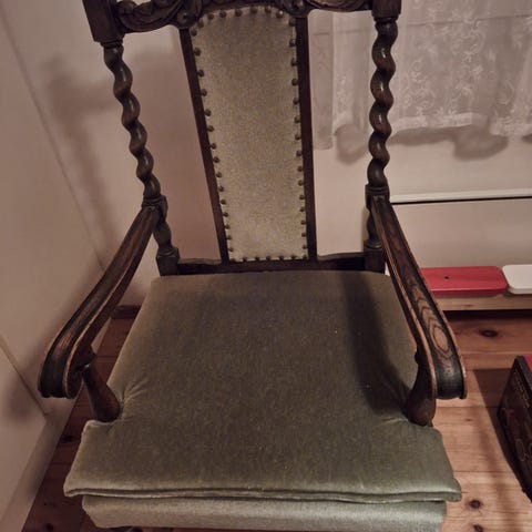 Kivan kokoinen tuoli pieneenkin tulaan. Jämäkkä. Pieni verhoilun rikkoutuma käsinojassa ks. Kuva