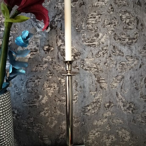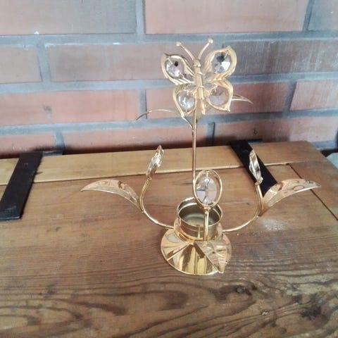 Metallinen, viidelle kynttilälle, korkeus ilman kynttilöitä 130 cm, leveys enimmillään 52 cm.