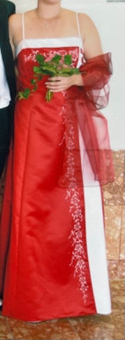 Myydään punainen juhla/hääpuku. Koko 38/40 (muokattu). 165cm pituisella ihmisellä ollut.