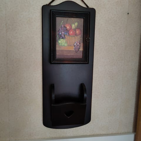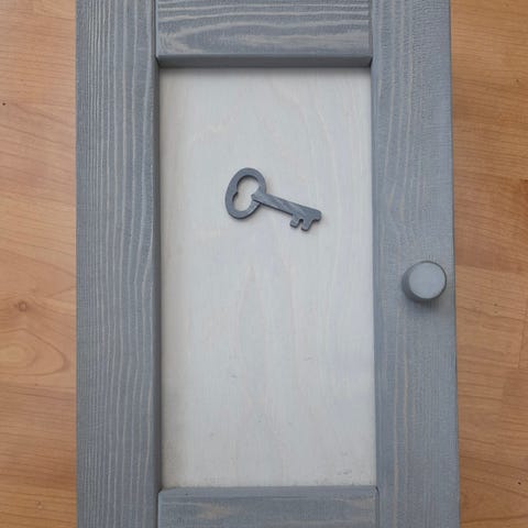 Vuokrattavalla kesämökillä käytetty avainkaappi, jossa vielä ohjetekstit sisällä, mutta ne saa poistettua. Kaappi on kevyttä puuta, alaosassa ovessa lasinen valokuva. Mitat: korkeus 32 leveys 22,5 syvyys 8 cm