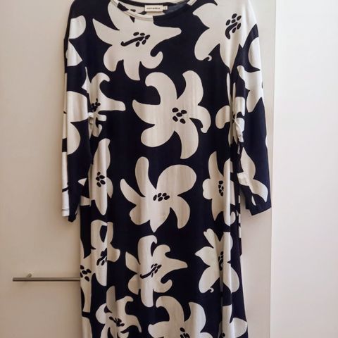 Ihana, kauniisti laskeutuva,musta-valkoinen, puuvillasta valmistettu Marimekon Geira villinarsissi mekko koossa 34, mielestäni reilu mitoitus.