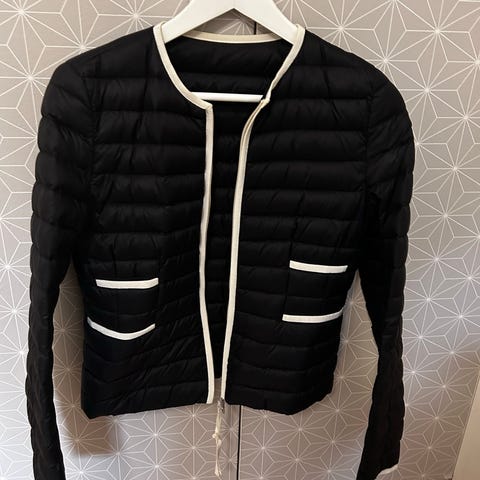 Moncler untuva kääntötakki, toinen puoli musta , toinen kuosillinen. Kevyt, vähän käytetty kuin uusi. Menee M ja L kokoiselle