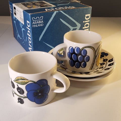 Arabia Paratiisi 2 kpl kahvikuppi ja 1 kpl lautanen, mustavalkoinen
