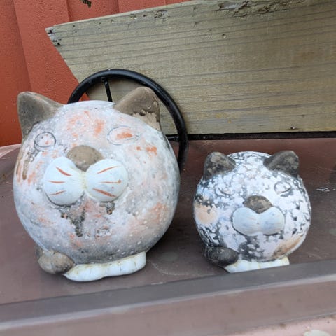 Pieniä posliini kissoja. Kolme samanlaista h 7cm: kaksi moitteetonta 3e/kpl, yhden korvan kärjessä pieni särö 2e. Kaksi taakseen katsovaa kissaa h 6,7cm, moitteettomia 3e/kpl.