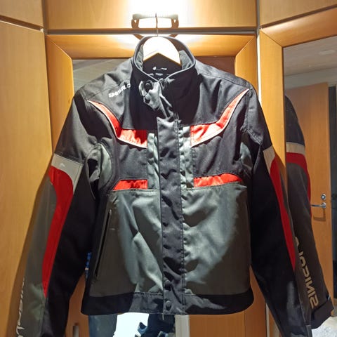 Motopalvelu Orimattilasta ostettu sinisalon takki. Koko 50 vastaa siis M kokoa. Takki varmasti suojaa hyvin jos käy asvaltille tai maahan kaatuminen. Nouto Porvoo.
