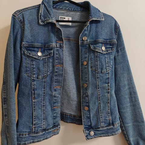 Kuvan mukainen farkkutakki myynnissä. Huom. muutama pieni reikä (en tarkoita asiaan kuuluvia "koristereikiä").