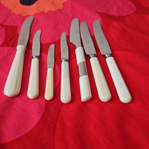 Hyvä kuntoiset pienet ” luupää ” veitset 6 kpl. Käy kattauksessa hyvin voiveitsestä