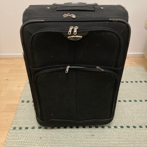 Musta matkalaukku, mahtuu käsimatkatavaroihin. Matkalaukun pyörät ovat kuluneet, mutta ne kuitenkin pyörivät. Koko 33x45x23