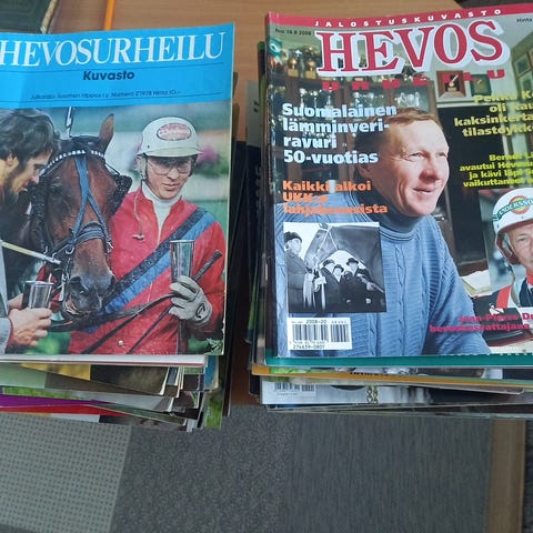 Pakettina Hevosurheilun jalostuskuvastot 1984, 1986 ja 1988 sekä talvikuvasto 1984. Kahdessa lehdessä kastumisesta johtuvaa jälkeä, myös kansissa kulumaa ym., ks. kuvat. Kaikki lehdet kuitenkin ehjiä ja täysin luettavassa kunnossa, ei sotkua, merkintöjä tai irtosivuja.
