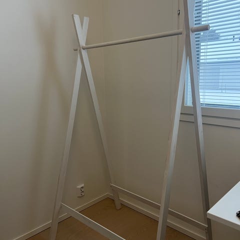 Myynnissä valkoinen metallinen vaaterekki. Vaaterekki on ehjä ja hyvässä kunnossa. Valmiiksi koottu.