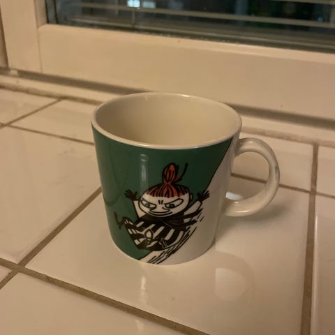 Arabian muumimuki 'Pikkumyy liukumäessä', Myyn asussa mustavalkoinen väritys