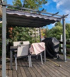 Kuvan pergola. Kangas vuodelta 2021 ja menee vielä. Yksi kankaan ripustuslenkeistä poikki ja yhtä kannatinta lyhennetty (katso kuvat), ei haittaa käyttöä. Pergola on purettu ja valmiiksi osissa. Vain nouto Lukonmäestä.