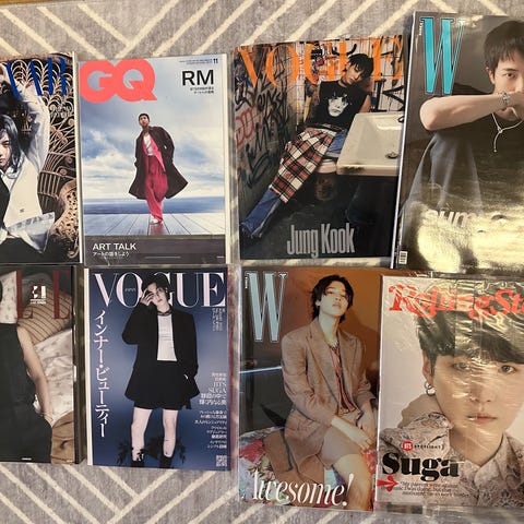 Kolme GQ Korea 2022 lehteä, joissa BTS V, Jimin ja sitten koko poppoo kannessa ja myös sisällä. Lehdet ottaneet vähän tietysti osumaa kulmista, mutta muuten erittäin hyvässä kunnossa. Tekstit sisällä koreaksi.