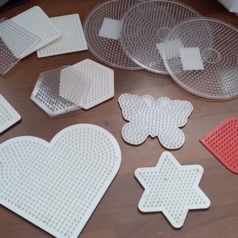 Hamahelmistä valmistettuja tähtiä, sydämiä, hevosia, ihmisiä yms. yli 70 isompaa hahmoa tai kuviota.