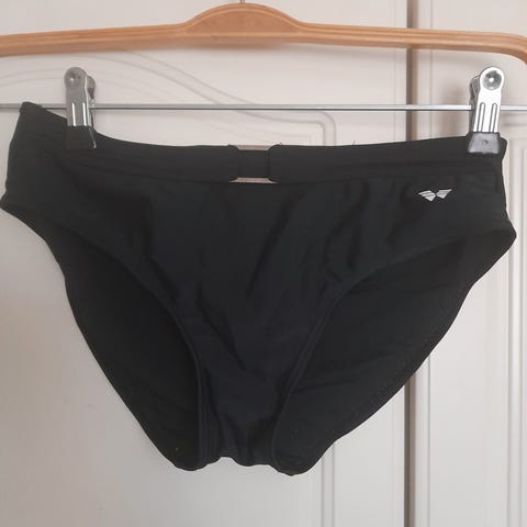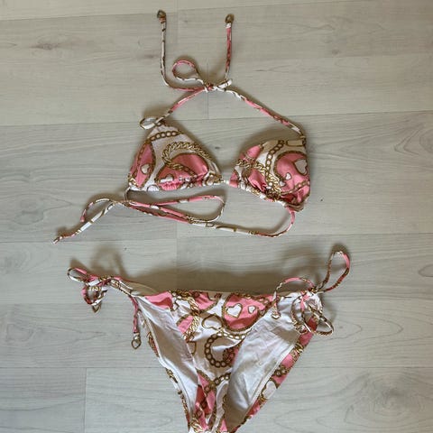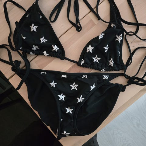 Musta bikinin ylä osa, jossa valkoisia tähti kuvioita. Solmittava kiinnitys, eli portaaton säätö mahdollisuus. Kiinnitys tulee niskantaakse. Osa vaalenpunaisista tähdistä rikkoutunut/pudonnut kokonaan pois, eivät haittaa käyttöä.