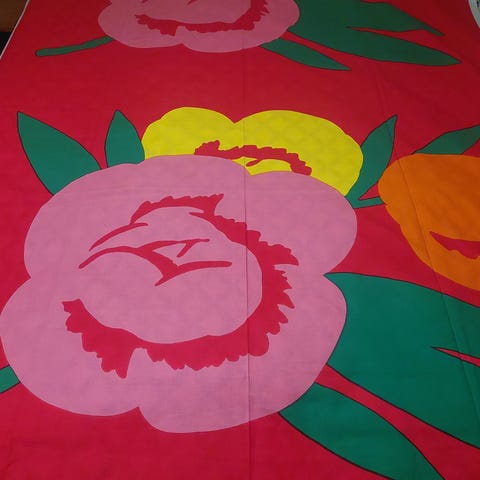 Hakusanat Marimekko Fujiwo Ishimoto Tuomi kukkii 1992 vintage vintagekangas suomalainen tekstiili marikangas marimekon retro retrokangas verhokangas verho pöytäliina