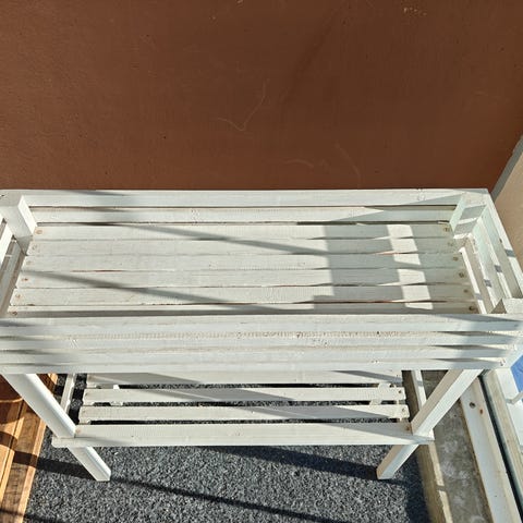 Oranssin värinen metallinen erikoinen kukkateline. Ehyt, elämää nähnyt maali pinnassa. Vintage tai vanhempi? Kork. 78 cm, lev. 96 cm. Jalkaosa 35 x 67 cm. Hieno!