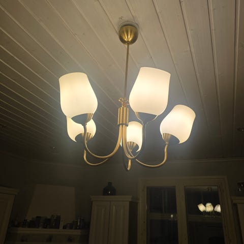 Upea valaisin korkeisiin tiloihin! Nuuran valmistama Miira 3 -riippuvalaisin messinkiä ja opaalilasia. Myymälämalli.