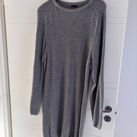 Pari kertaa päällä ollut pitkä Puran Love polo knit -neule vaaleanharmaana, itselle väärä malli. En ole edes pessyt. Olen muutamalla lankapistolla ommellut alahelman sivuhalkiot kiinni, mutta ne saa halutessaan helposti avattua. Maksoin itse tästä 260 euroa. Tehty Suomessa.