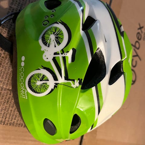 Naarmuton, ei kolhittu lasten pyöräilykypärä. Koko 46-51, paino 210g. Sopii noin 2-3v lapselle. Solki suojattu ettei nipistä ihoa.