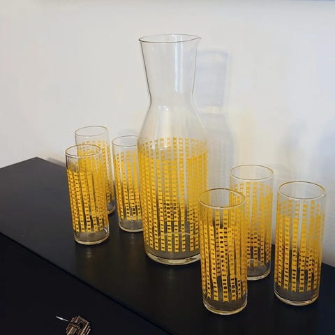 Myydään Helena Tynell Riihimäen lasi 1799 k. 24,5 cm karahvi ja k. 11,5 cm h. 4,2 cm lasit 5 kpl.