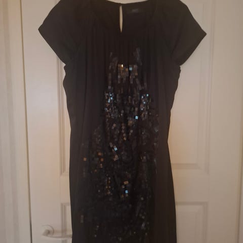 Espritin punaine juhlamekko. Kauluksessa helmikuviointia ja sisältää vyön. Koko 42, mutta on melko kapea malli. Ei sovi kovin rintavalle naiselle.