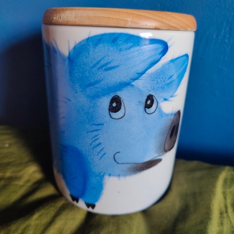 Isomman puoleinen keraaminen purkki vaikka kekseille tai keittiövälineille. Vihreä ja pinkki possu pitävät toisiaan saparoista.
