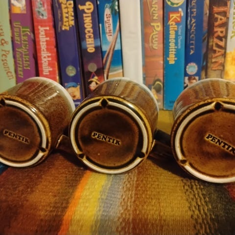 Kuusi Peter Winquistin Pentikille suunnittelemaa korvatonta Kanerva-kuppia. Sopii esim espressolle. Kaikki yhteensä 15€.