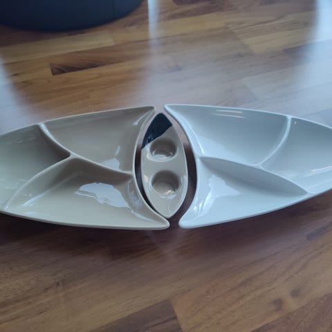 Vuoat käyttämättömät. Tarjotinsetti ollut koristeena. Metalliosissa pieniä kulumisen jälkiä. Vuoat uudenveroiset.
