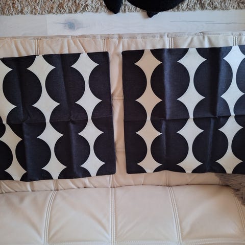 1 kpl verho koko 2,40×1,20. 2kpl tyynynpäällisiä koko 35×60cm. Pyöreä tyyny