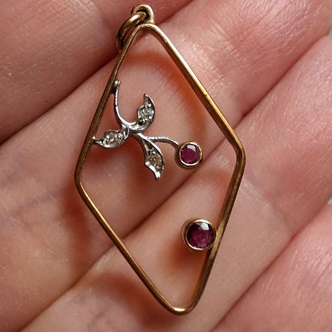 Vanha kullattu hopeariipus, jossa kivenä ametisti. Kultaus on jonkin verran kulunut (katso kuvat). Riipuksen halkaisija 2.3 cm, leimat 83, 925. Ketju ei ole hopeaa, sen pituus 41 cm.
