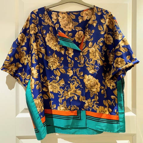 Metallinhohtoinen, tummanvihreä upea juhlapaita. Röyhelökaulus. Kietaisunauhat vyötäröllä vyötärön ympäri. Toisessa alahelmassa aukko, josta vyö kiedotaan vyötärön ympäri. 3/4 osa pituiset hihat. Kokoa ei mainita, mutta uskoisin XL/42. Kankaasta ei tuoteselostetta. Satiinimaisen upea. Hienopesu. Kangas samannäköinen sisäpuolelta.