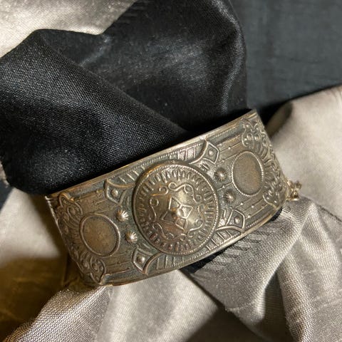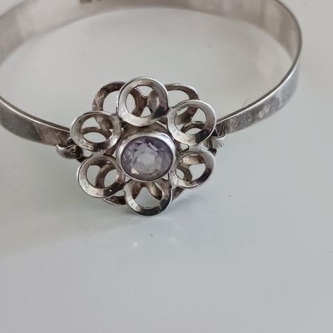 Kaunis hopeinen vanha rannerengas. Leima, jossa KM,kruunu, 916H, kruunu ja MZ. Eli vuosien 1925-1968 välillä valmistettu. Koko 5,5 x 6 cm. 3 cm rako ranteeseen laittamista varten .Leveys 1,5 - 2,8 cm. Ehjä ja siisti.