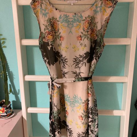 Ruotsalaisen Kool Annan klassisen yksinkertainen mustavalkoinen juhlamekko ruusukuviolla. Alaspäin levenevä helma, irroitettava kangasvyö.